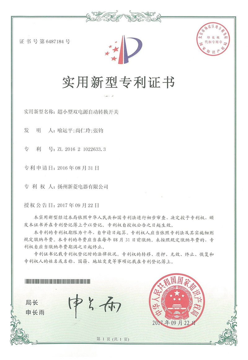 2017年9月22日,我司一項實用新型專利“超小型雙電源自動轉換開關”獲得國家知識產權局正式授權,專利號:ZL 2016 2 1022633.3